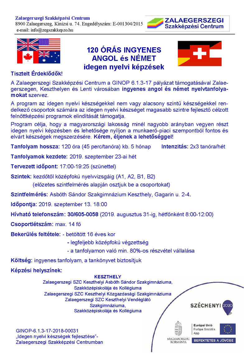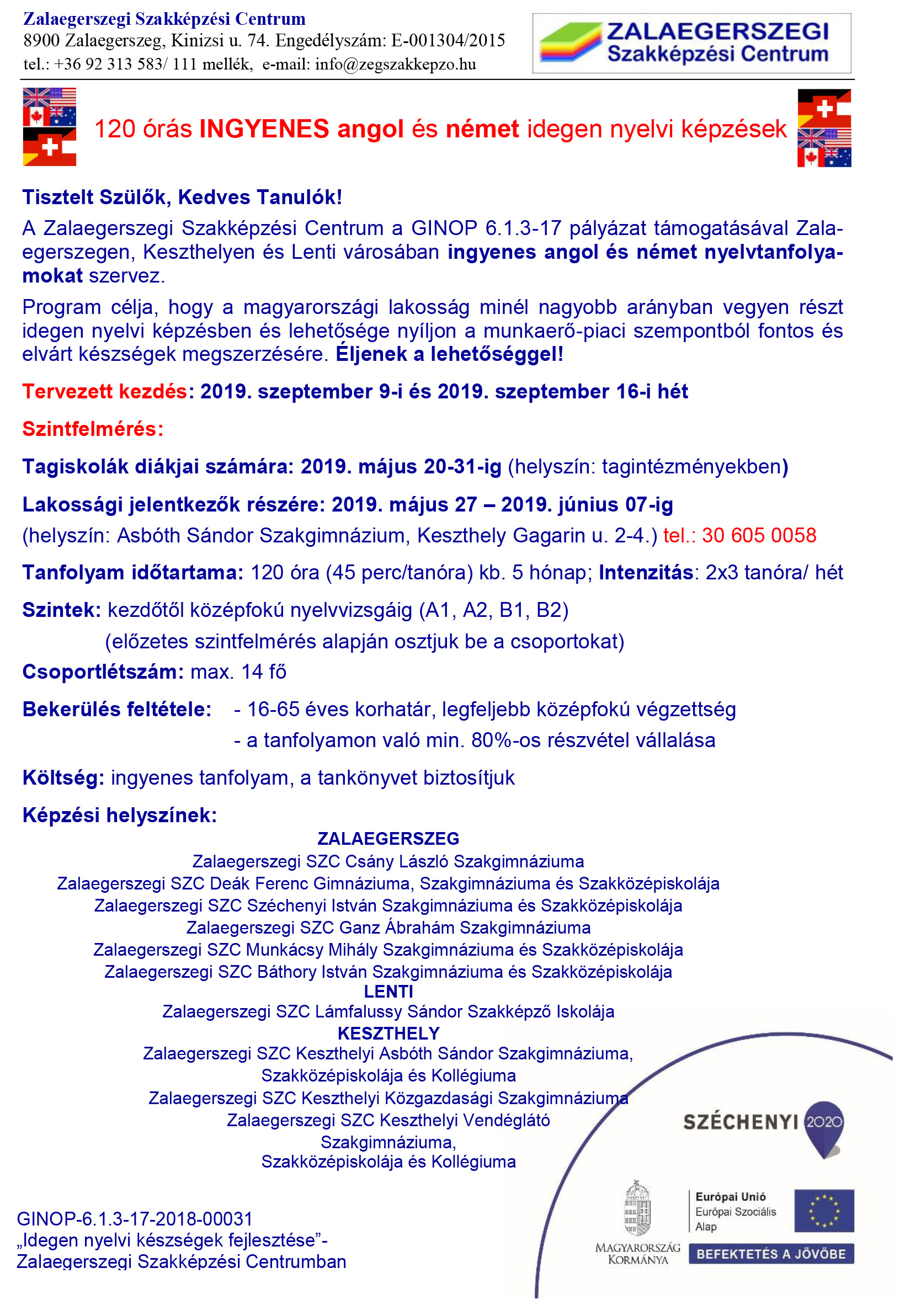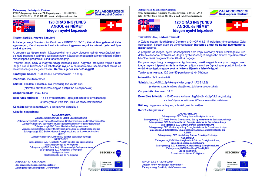 A Zalaegerszegi Szakképzési Centrum a GINOP 6.1.3-17 pályázat támogatásával ingyenes angol és német nyelvtanfolyamokat szervez. |
